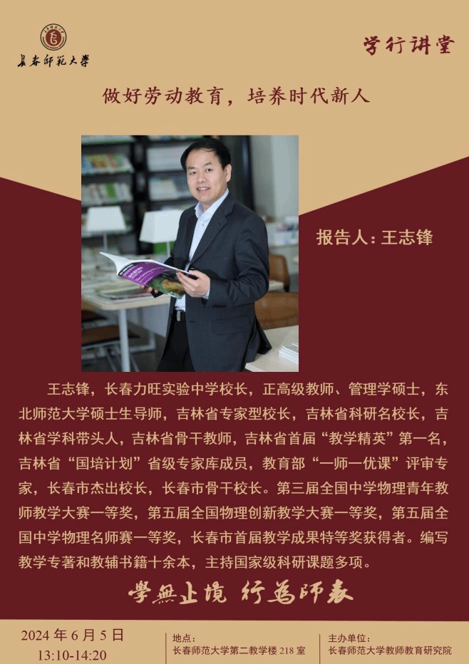 王志锋,长春力旺实验中学校长,正高级教师、管理学硕士,东北师范大学硕士生导师,吉林省专家型校长,吉林省科研名校长,吉林省学科带头人,吉林省骨干教师,吉林省首届“教学精英”第一名,吉林省“国培计划”省级专家库成员,教育部“一师一优课”评审专家,长春市杰出校长,长春市骨干校长。第三届全国中学物理青年教师教学大赛一等奖,第五届全国物理创新教学大赛一等奖,第五届全国中学物理名师赛一等奖,长春市首届教学成果特等奖获得者。编写教学专著和教辅书籍十余本,主持国家级科研课题多项。